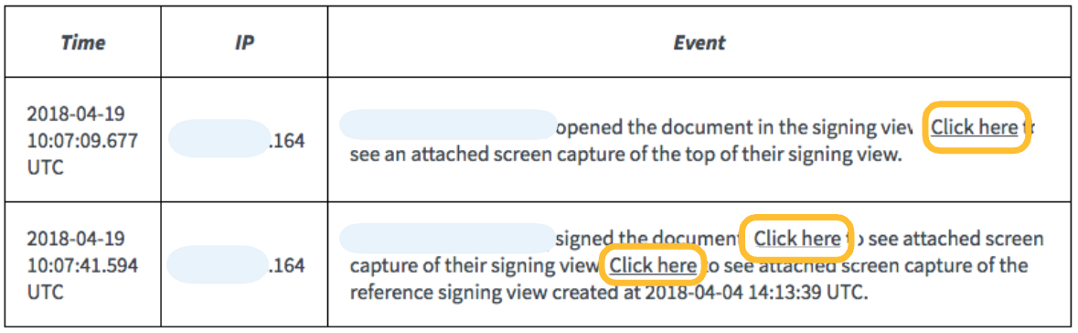 Die Absichtsbeweisdatei enthält normalerweise Bilder dessen, was die Unterzeichner auf ihrem Bildschirm gesehen haben. Da es sich um ein clientseitiges Skript handelt, ist es aufgrund von Browsereinstellungen oder Browserfehlern manchmal nicht möglich, einen Screenshot zu erstellen. Wenn es funktioniert, ist es jedoch das, was der Unterzeichner gesehen hat. Die Absicht, diese Screenshots zu erstellen und zu speichern, besteht darin, zu beweisen, dass die unterzeichnete Vereinbarung angezeigt wurde und dass auf der zum Unterzeichnen verwendeten Schaltfläche nichts anderes als „Unterzeichnen“ (in der einen oder anderen Sprache) stand.