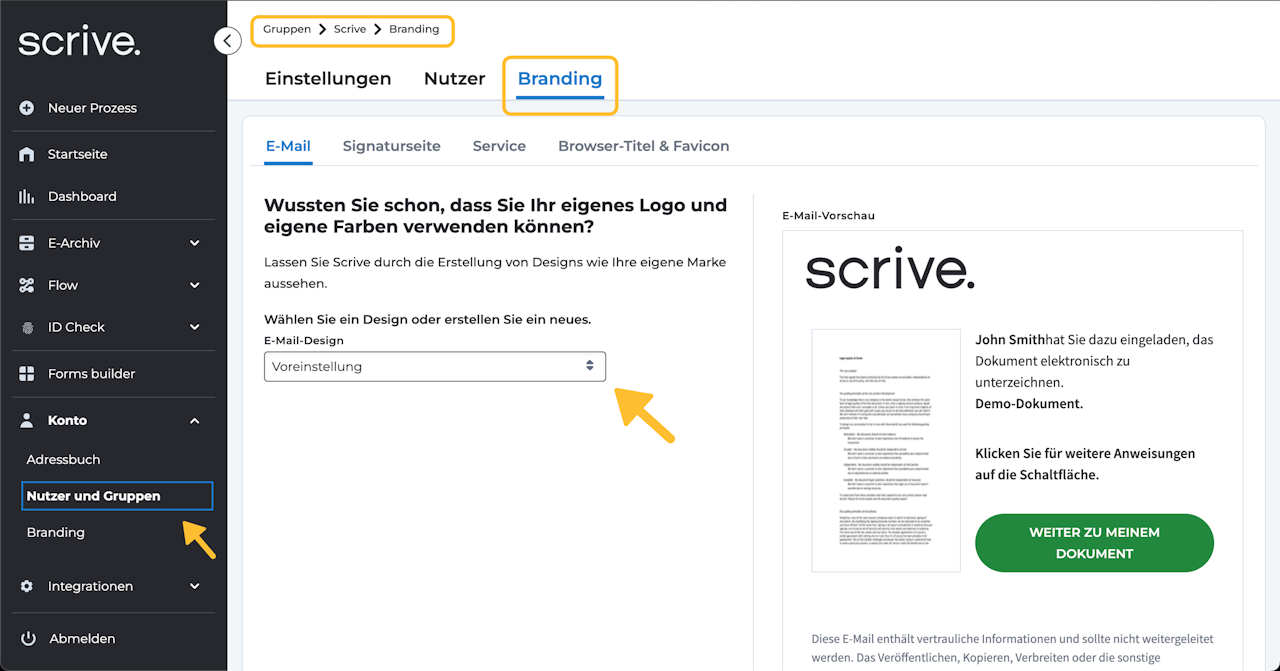 Beim Einrichten Ihres Brandings können Sie entweder das Standard-Branding von Scrive verwenden oder ein eigenes Theme erstellen.