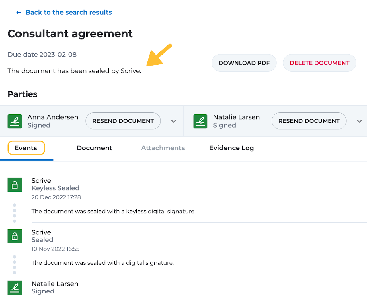 Um detailliertere Informationen zum Status eines Signaturvorgangs zu erhalten, navigieren Sie zu Ihrem E-Archiv und klicken Sie auf den Dokumenttitel in der Liste, um die Prozessseite zu öffnen. Suchen Sie im Abschnitt „Ereignisse“ nach den neuesten Aktionen aller am Prozess beteiligten Parteien.