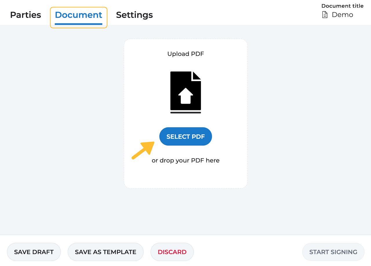 Unter der zweiten Registerkarte in der Entwurfsansicht haben Sie die Möglichkeit das zu unterzeichnende Dokument hochladen. Klicken Sie auf „PDF auswählen“ oder ziehen Sie die Datei zum Hochladen mit Ihrer Maus in das Feld.