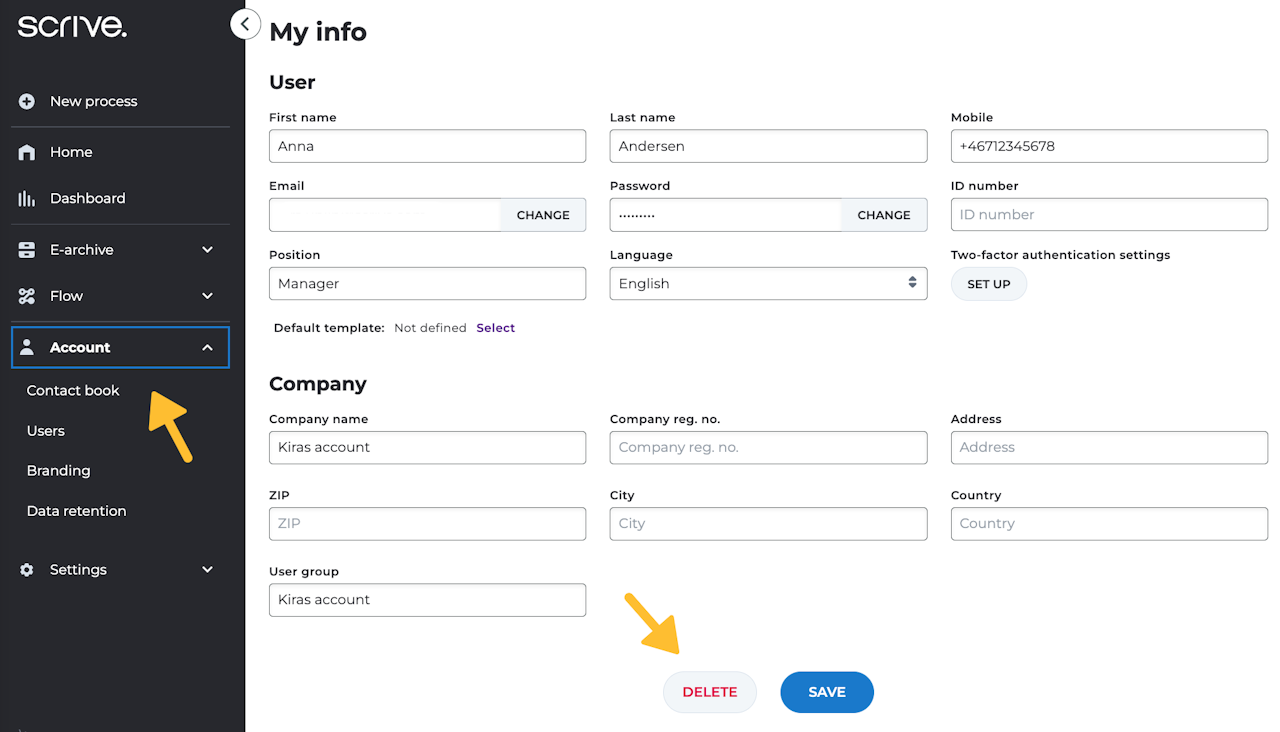 Wenn Sie ein Einzelbenutzer waren, werden beim Löschen alle Ihre Dokumente zusammen mit Ihrem Konto entfernt. Wenn Sie Teil einer Benutzergruppe waren (z. B. innerhalb eines Unternehmens unter Ihren Kollegen), sind Ihre Dokumente weiterhin im E-Archiv der Benutzergruppe verfügbar und für die Administratorbenutzer der Gruppe zugänglich.
