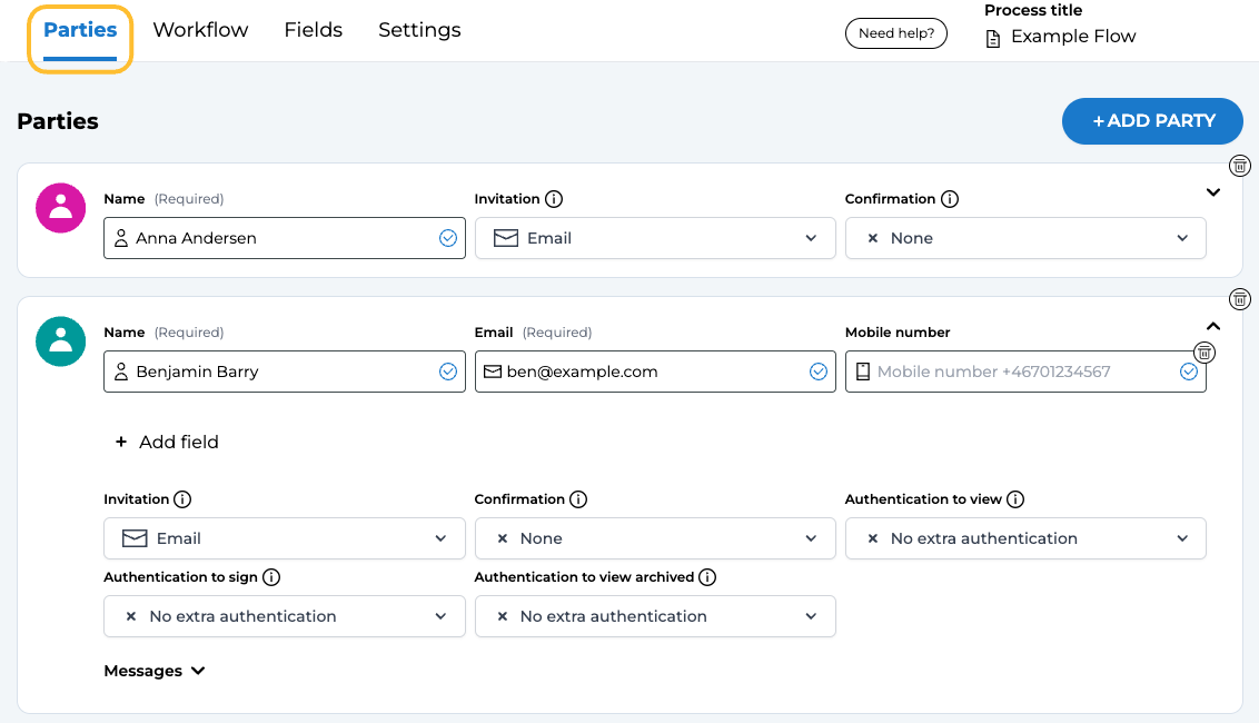 Auf der Registerkarte „Parteien“ können Sie Informationen zu den Personen hinzufügen und bearbeiten, die an Ihrem Unterzeichnungsprozess teilnehmen.