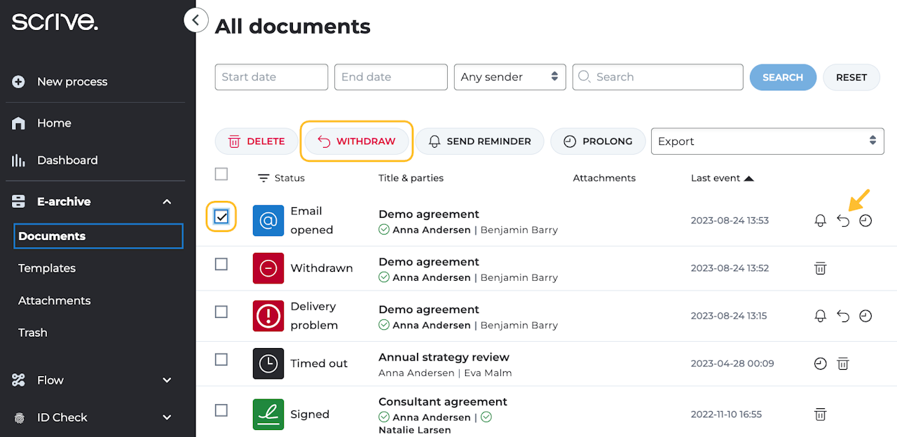 Durch das Zurückziehen eines Dokuments brechen Sie den Signaturvorgang unmittelbar ab und die zuvor versendeten Einladungen zum Öffnen des Dokuments verfallen automatisch.