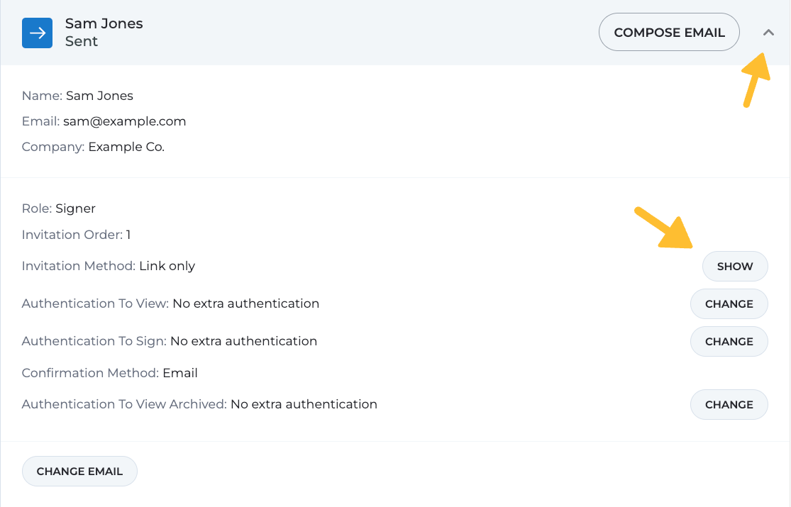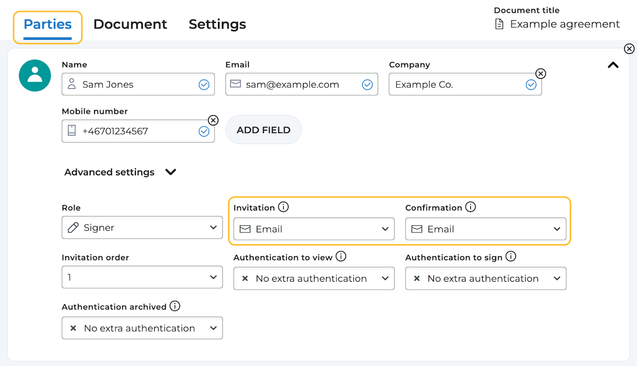 When inviting parties to view, sign, or approve a document, you have the flexibility to choose their notification preferences and decide on the confirmation method after the document has been signed by all parties. These settings are found under the "Parties" tab when you set up your document for signing.