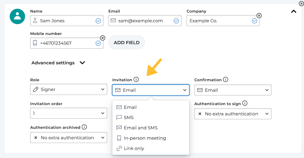 In-person meeting: No invitation will be sent. All communication happens live with the party and the option to sign is given on the process page once you have started the signing. This method is mainly meant to be used with Scrive's Retail eSign App.