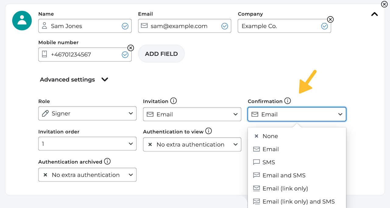 The confirmation decides how a party will be notified when the document has been signed and the process is completed. You can choose between the following methods: