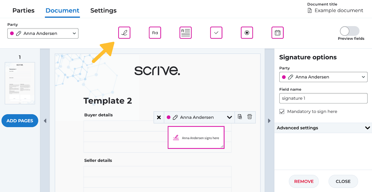• Mandatory to sign here: If enabled, the signing party must add their signature here before they can sign the document.