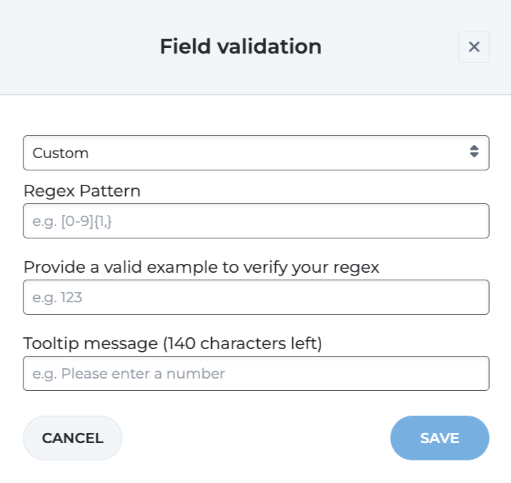 If the example does not correspond to the added regex, the field will turn red. You can choose to include a description, 'Tooltip message', to instruct signatories on what information to add.