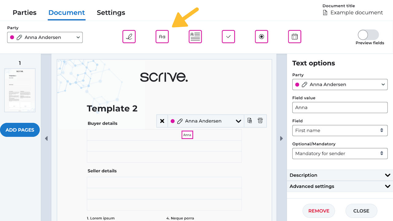 Creating a new custom text field in the document will result in the same field appearing under the relevant party on the Parties tab.