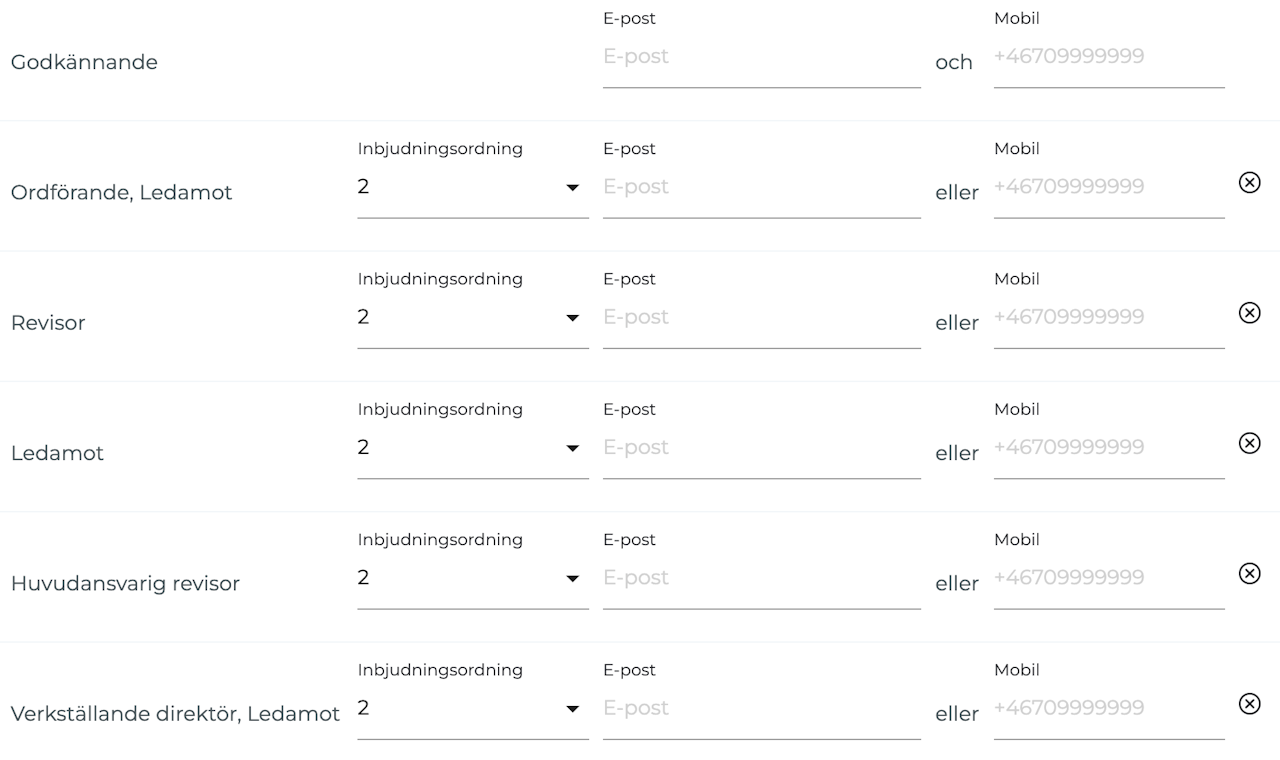 Step 3: Begin by filling out your own name, email and mobile number in the first row. Then, fill out the email or mobile number for all other parties. To continue, click 'Gå vidare´ at the bottom of the page.