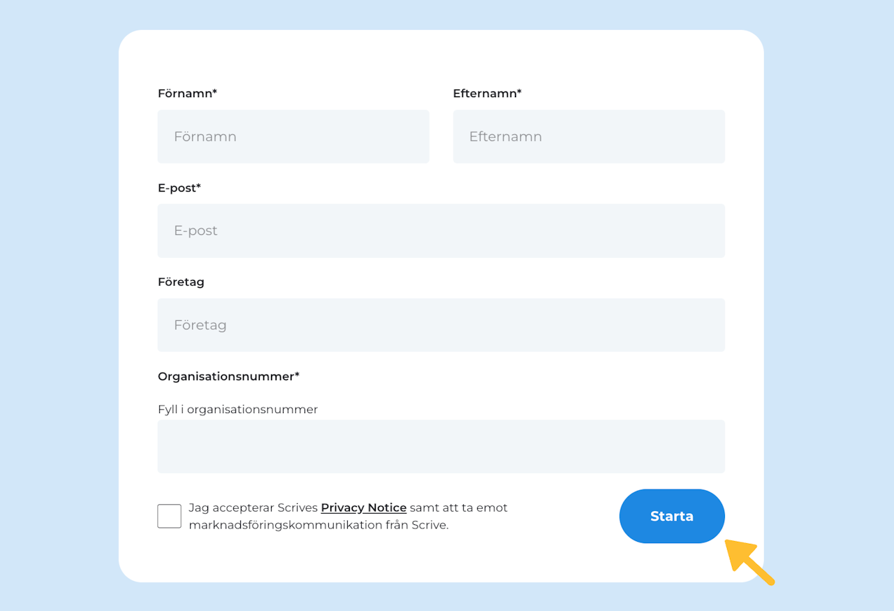 Step 2: Scroll down on the page and fill out your first name, last name, email, company name and company registration number. You will then need to confirm by checking the checkbox that you accept Scrive's Privacy Policy and agree to receive marketing emails in the future (which you can unsubscribe from later if desired).
