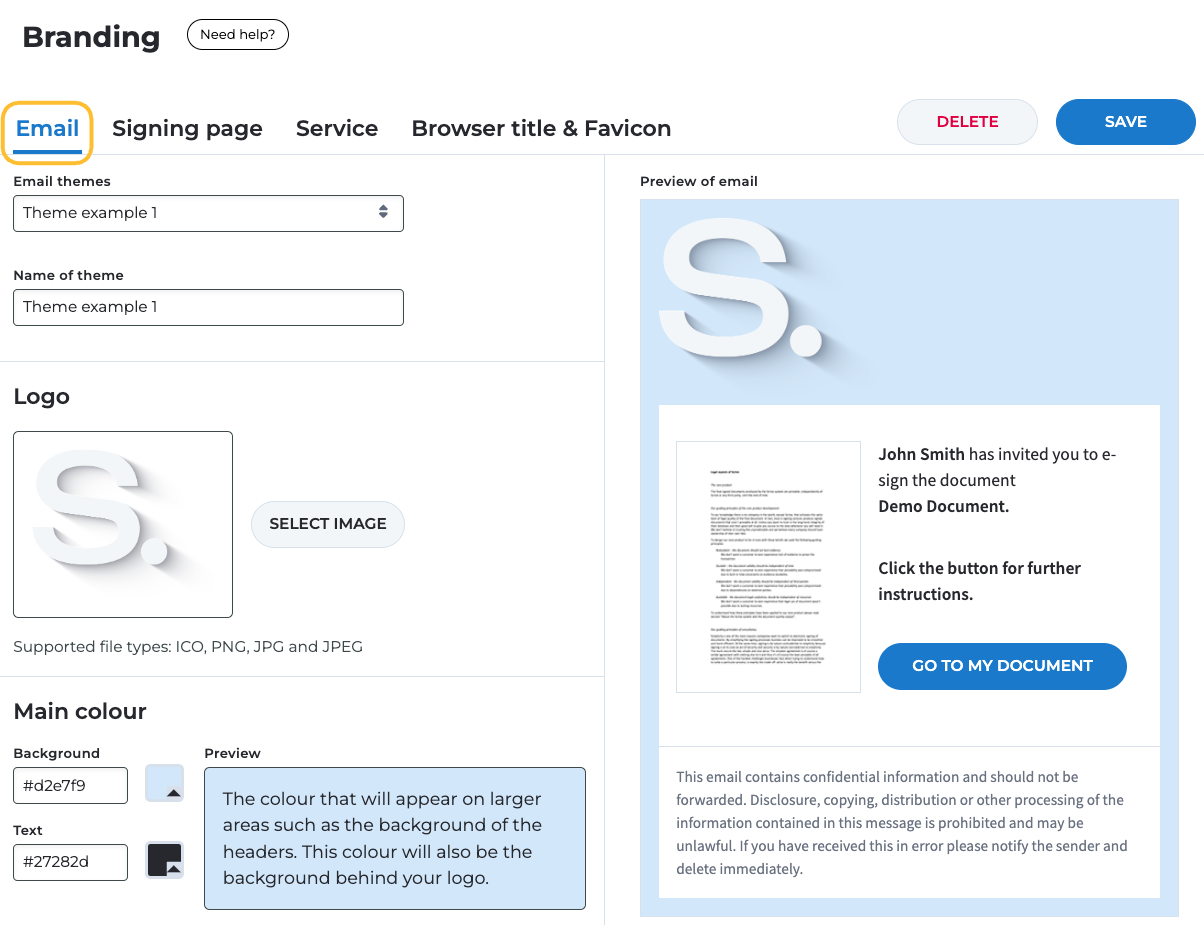 Branding for the invitation and confirmation emails sent to parties in your document processes. The following branding settings can be made:
