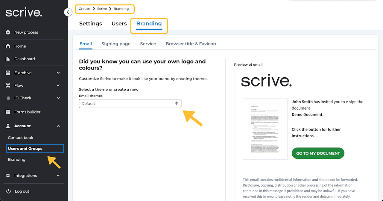 When setting up your branding, you can either use the default Scrive branding or create your own by adding a new theme.