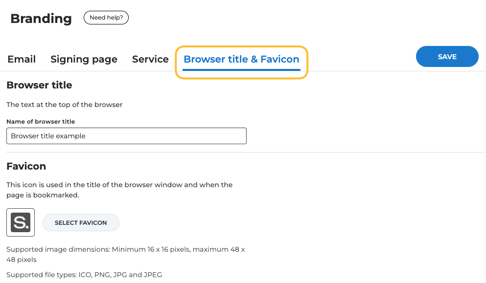 Favicon: the little image which is displayed in the browser tab when a party or one of your users is using Scrive. Needs to be a minimum of 16 x 16 pixels and a maximum of 48 x 48 pixels. Can be uploaded as a ICO, PNG, JPG or JPEG file.