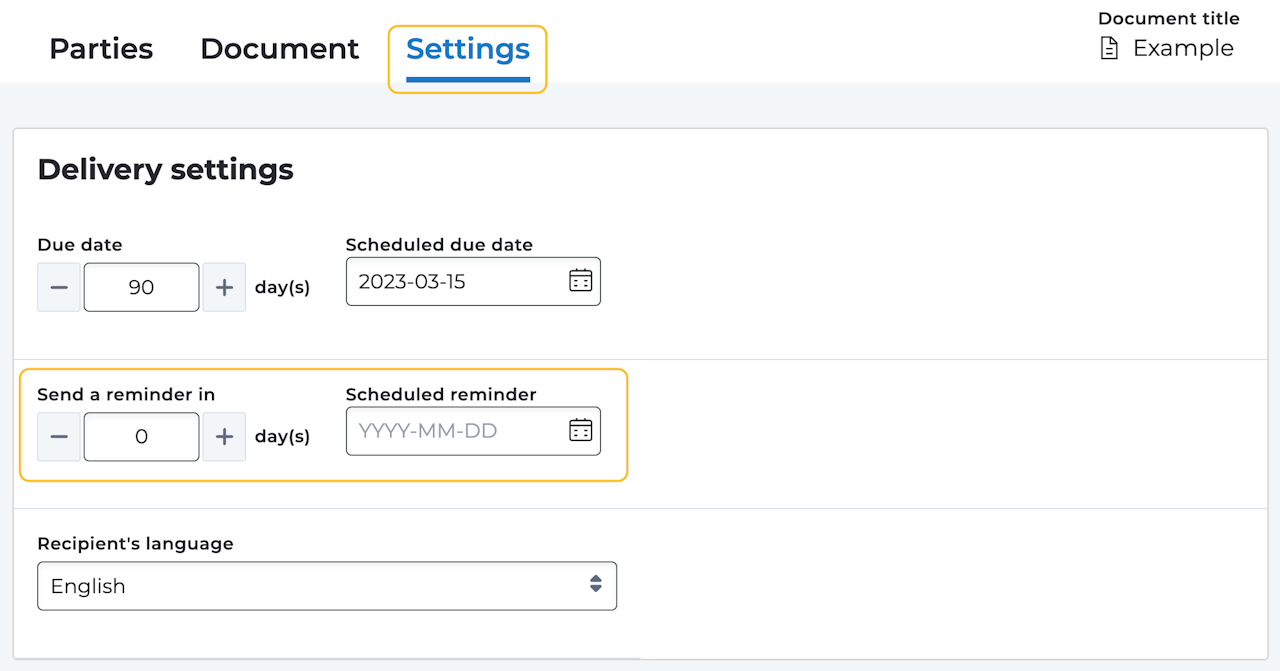 Stay on top of any pending signatures by setting a scheduled reminder. You have the option to set a specific date or define the number of days from the start of the signing process.