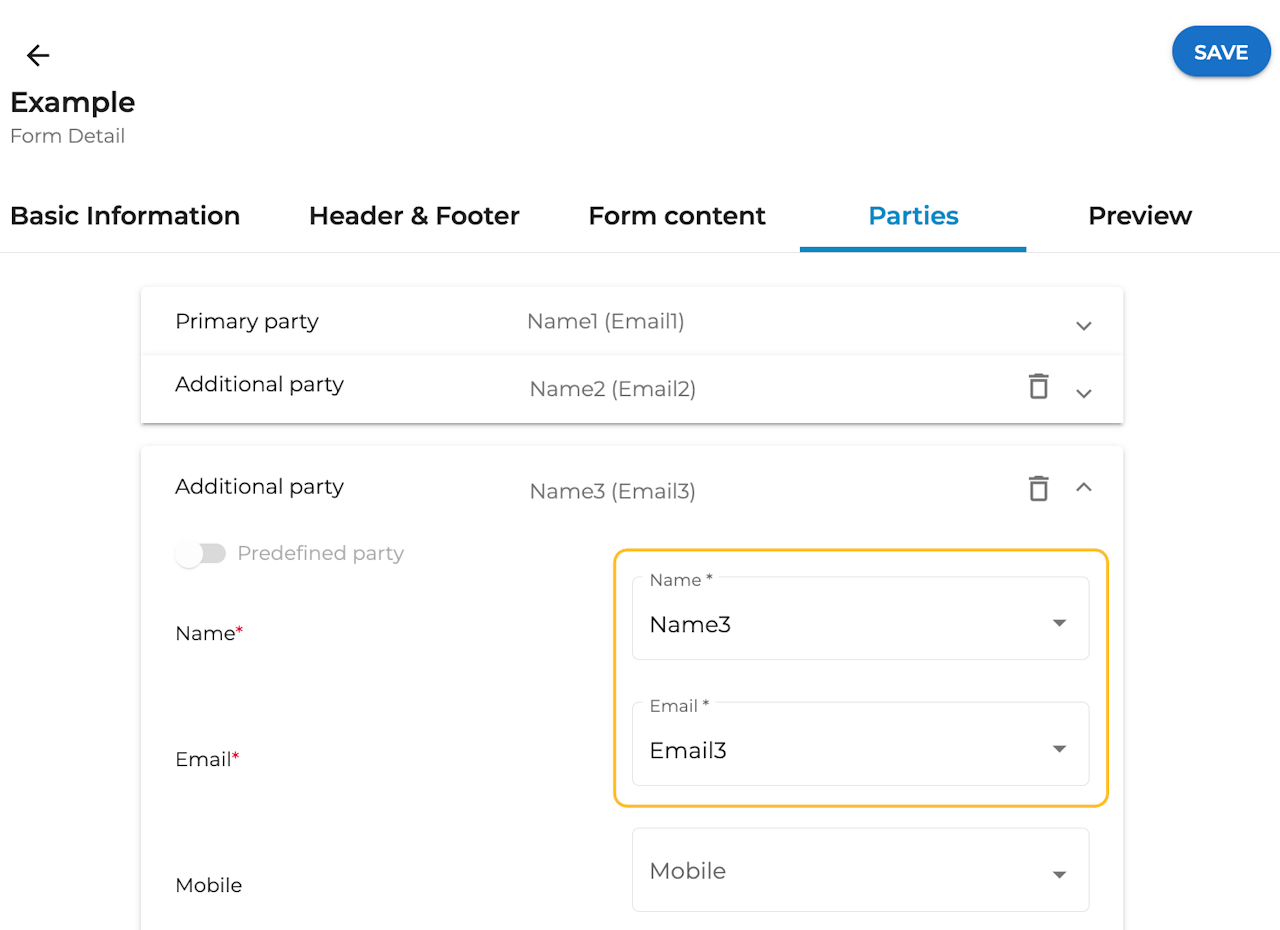 After adding fields for contact information to your form, it's time to map them to the additional parties under the 'Parties' tab.