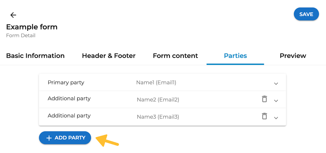 To add one or more additional parties, simply click "+ ADD PARTY".