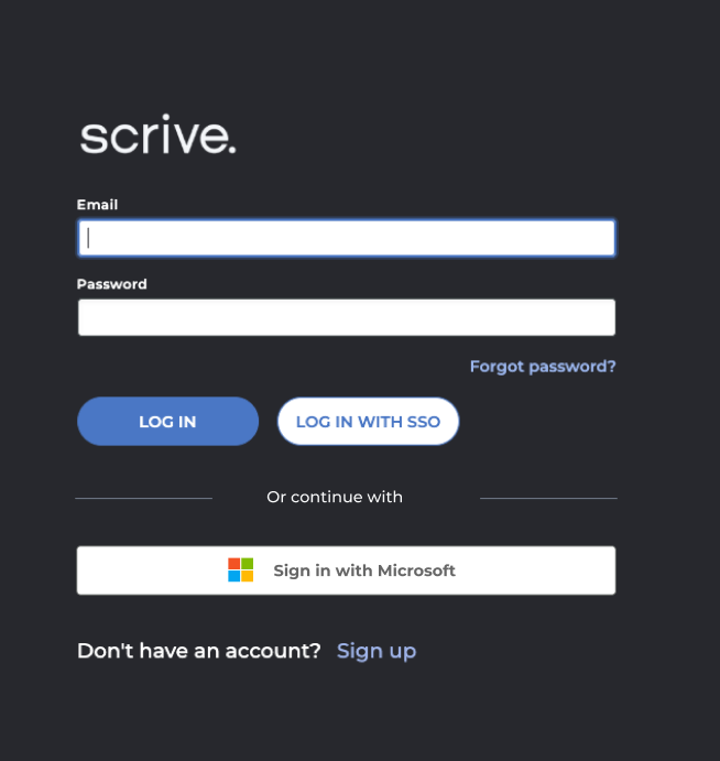 Scrive supports login with Microsoft accounts, providing users with a secure and convenient alternative to traditional email and password logins.