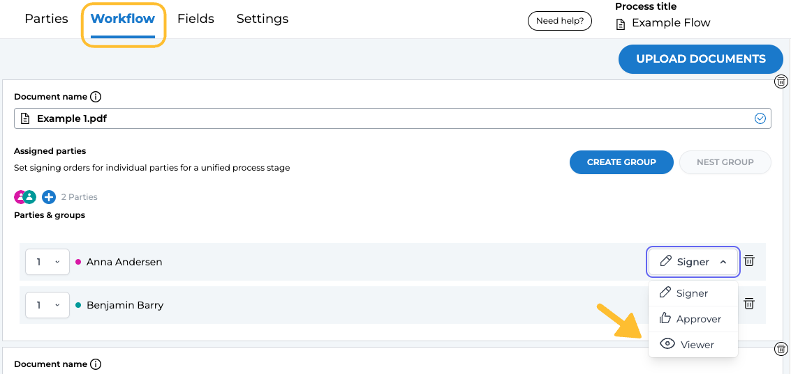 Consider an HR scenario where a document is sent from HR to an employee for signing. In this case, a manager is added as a third party and assigned the Viewer role. The manager can read and access the document but is not required to take any action on it.