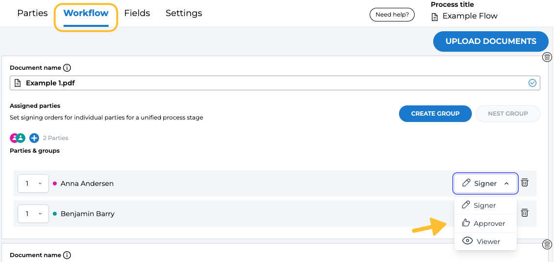 The Approver role is intended for individuals responsible for approving the contents of a document without signing it. The involvement of Approvers is visible to other parties in the document process.