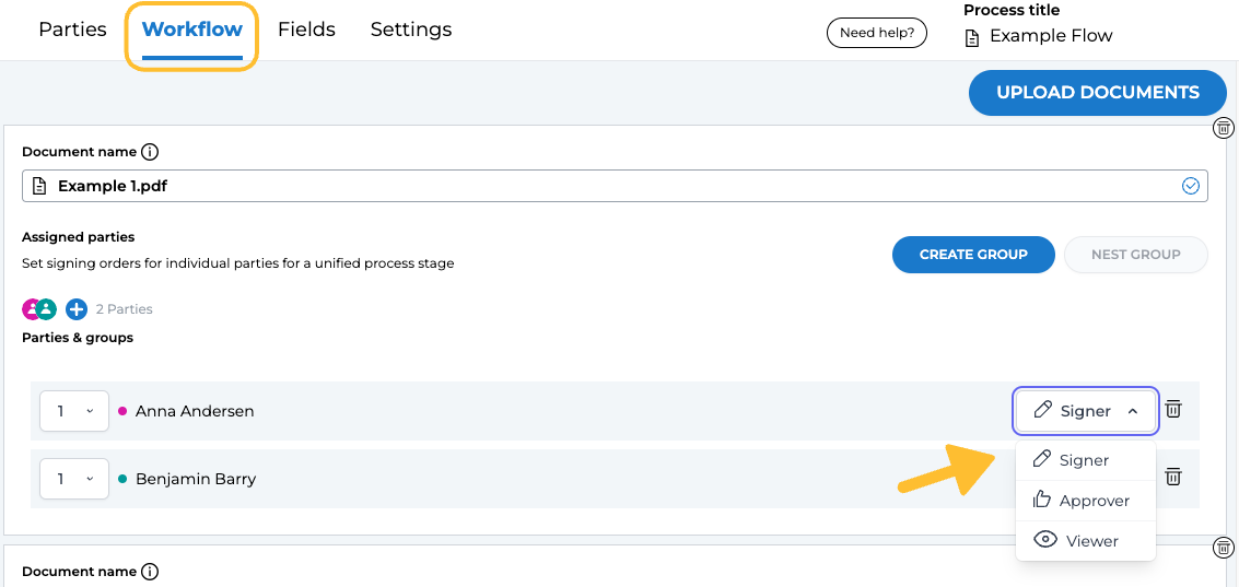 The role assigned to a party determines their specific responsibilities and actions within the document process. You have the flexibility to choose from three distinct roles, each defining the scope of the individual's involvement and influence on the process.