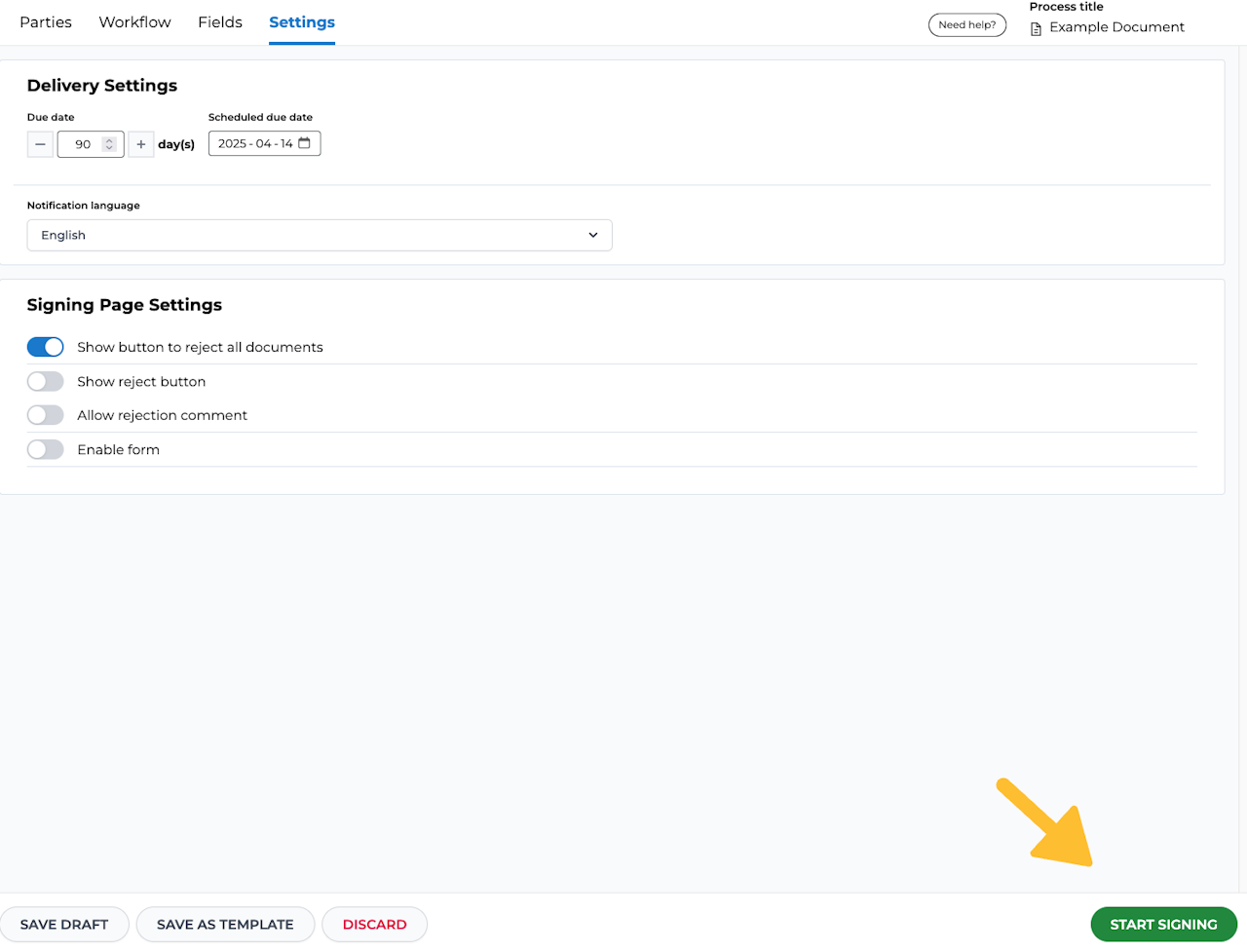 On the last tab "Settings" you have the option to set a due date for the document process as well as notification language.