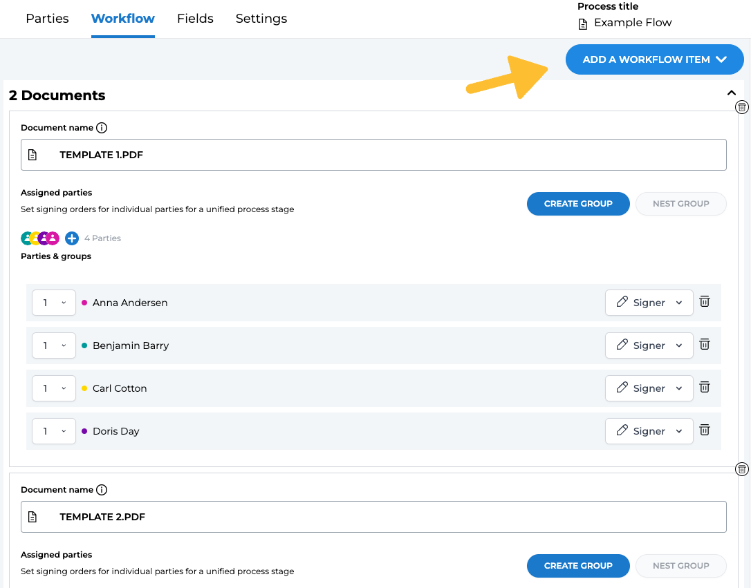 As a final step, on the "Workflow" tab, you have the option to assign which parties should take part of which documents. Here, you can also set an invitation order as well as role.