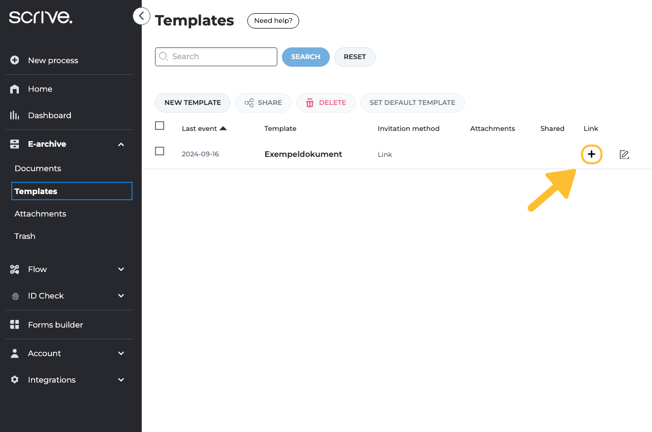 Go to your E-archive and Templates. Locate the template you previously prepared and click on the plus icon in the Link column to the right.