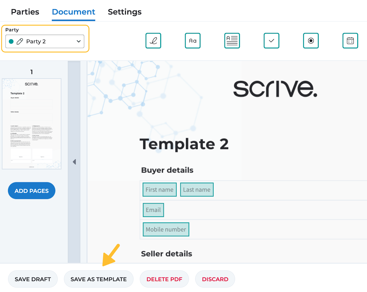 To gather information from the signing party, add fields to the document and ensure that 'Party' is set to Party 2 for the field.