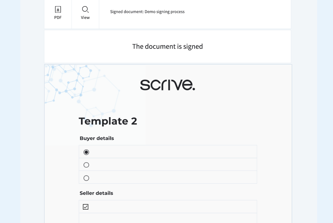 Once you have completed any required steps and clicked 'Sign', your part of the signing process is finished. If the signing was successful, you will see a confirmation message stating "The document is signed" above a preview of the signed document.