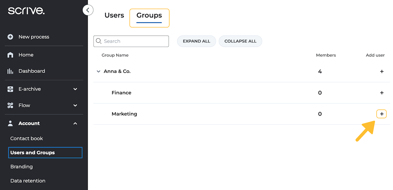 From the main menu on the left, navigate to 'Account' and 'Users and Groups' and open the 'Groups' tab.