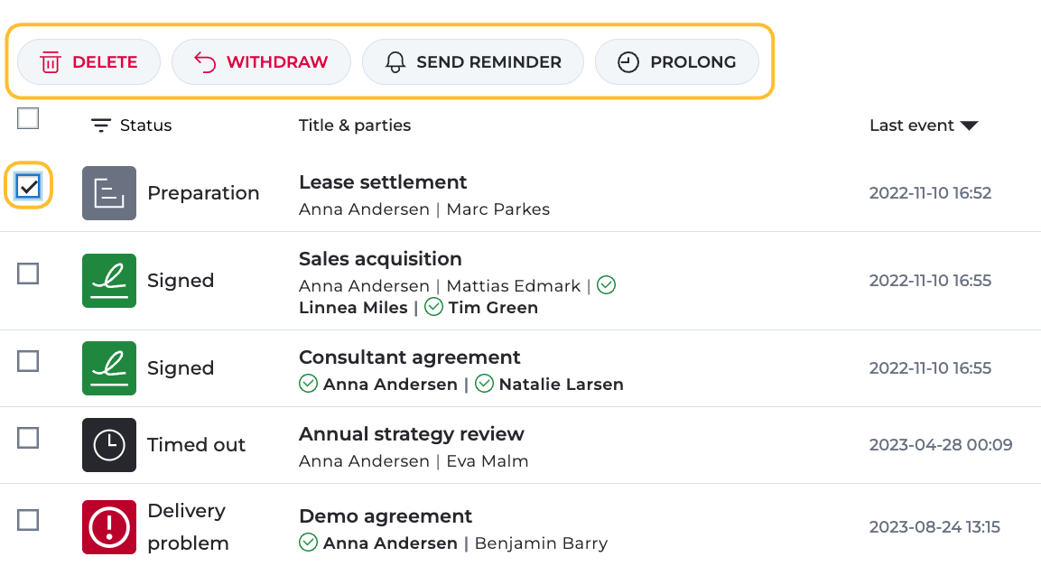 The available actions depend on the document's status and enable you to quickly delete, send reminders, withdraw, or extend the process due date.