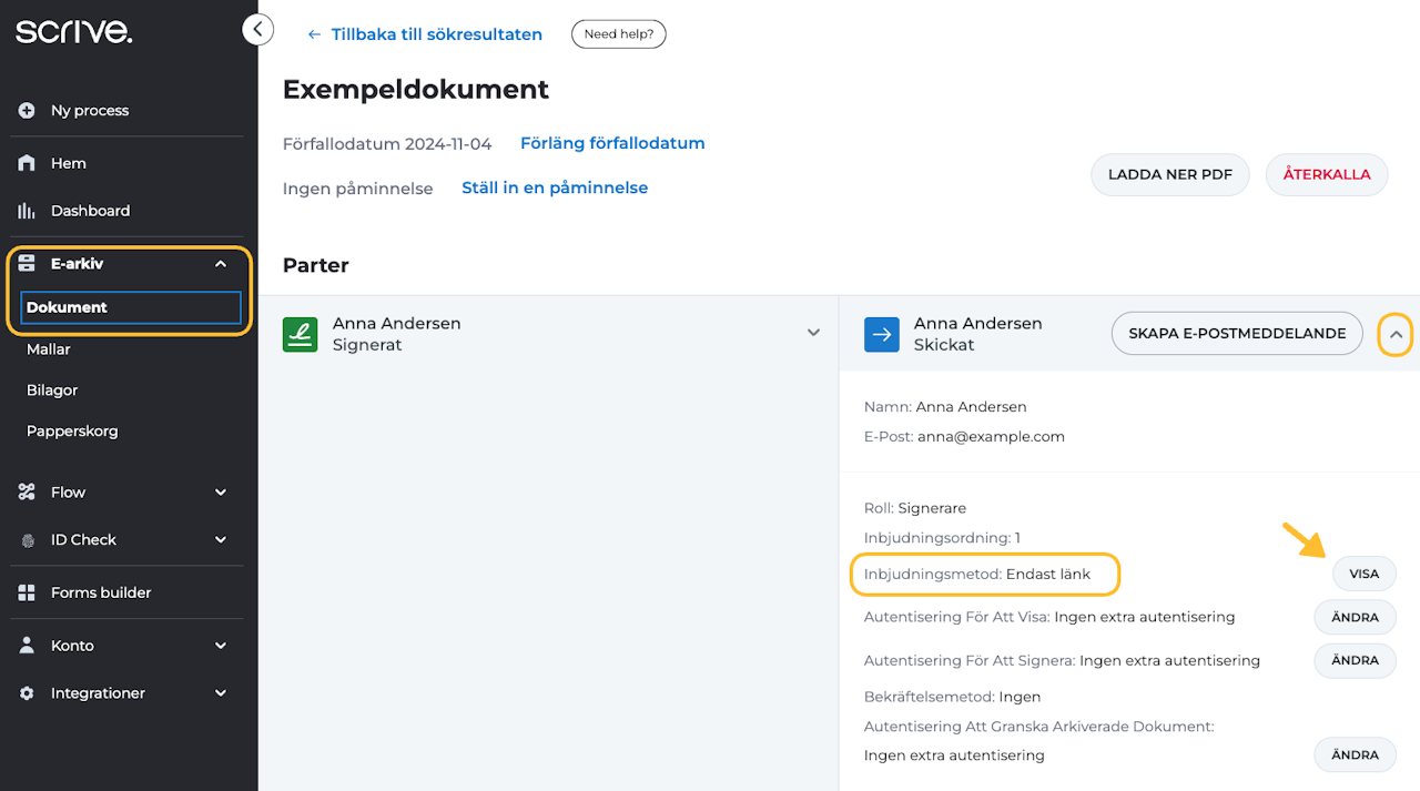 E-post och SMS: En inbjudan skickas automatiskt till både partens e-postadress och mobilnummer, inklusive en länk till dokumentet.