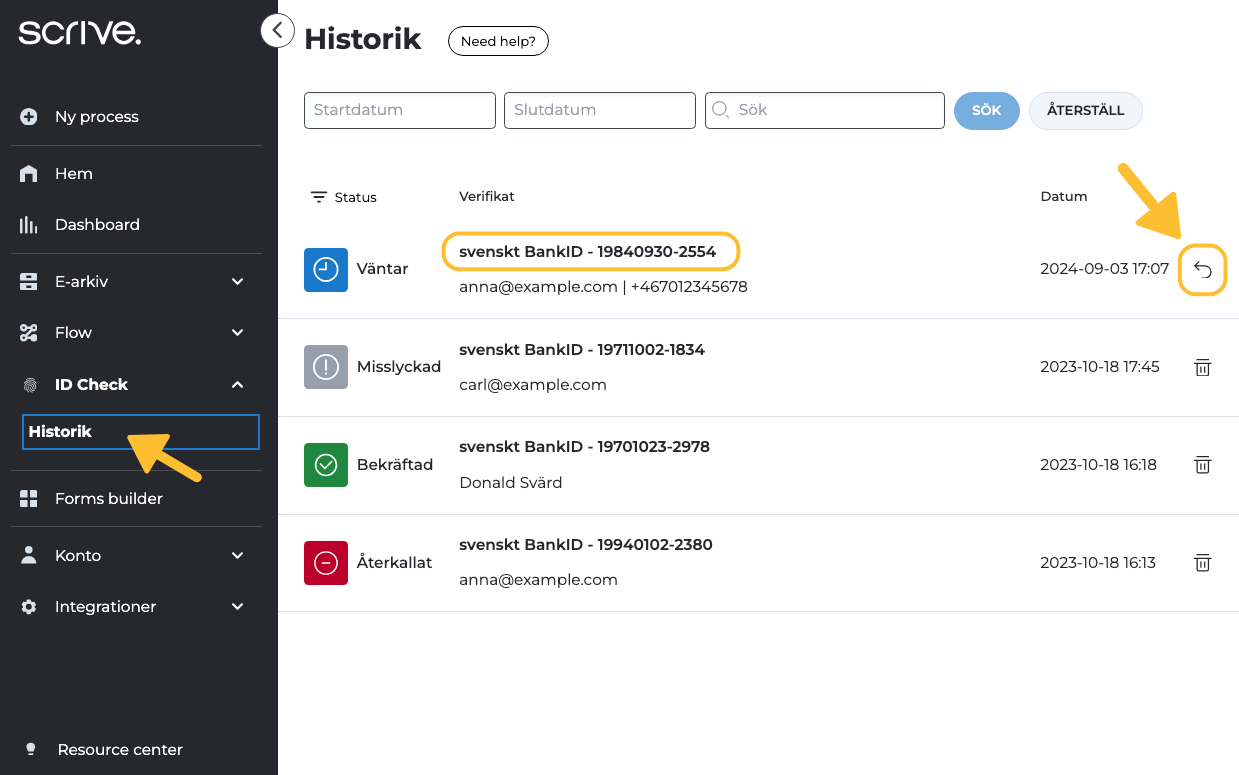 Navigera till "ID Check" i huvudmenyn till vänster och klicka på "Historik".