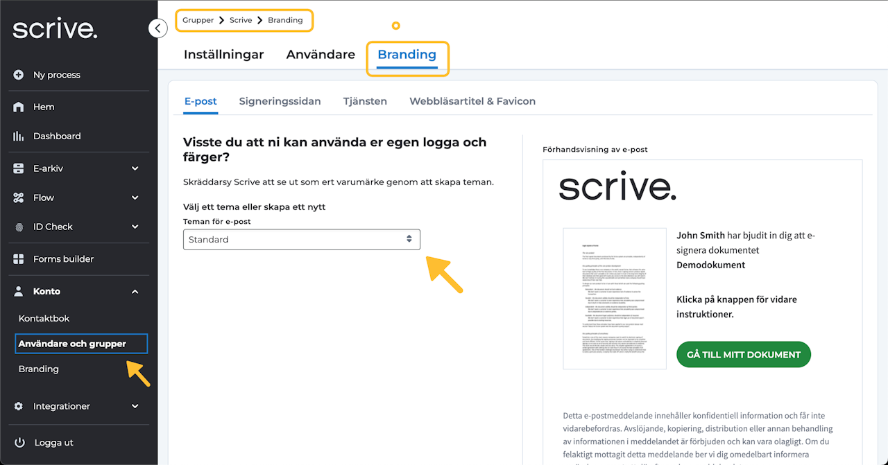 Skapande och hantering av branding-teman utförs av Scrive för en smidig upplevelse.