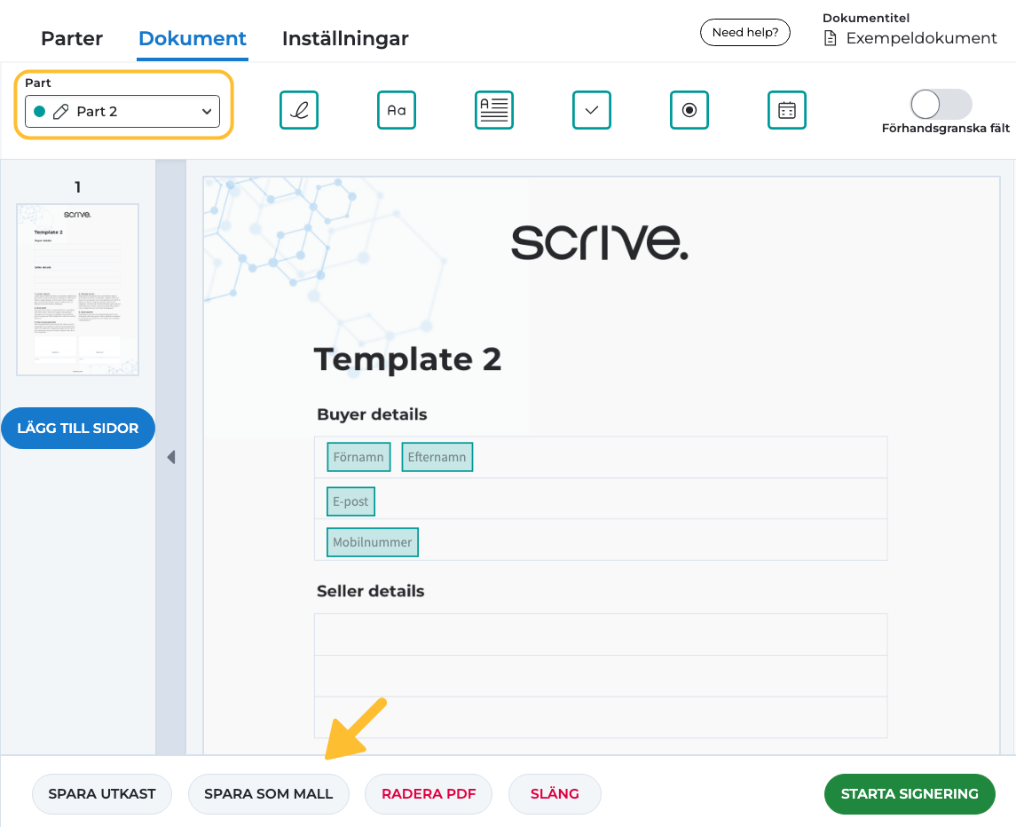 För att samla in information från signeringsparten, lägg till fält i dokumentet och se till att "Part" är inställd på Part 2 för fältet.