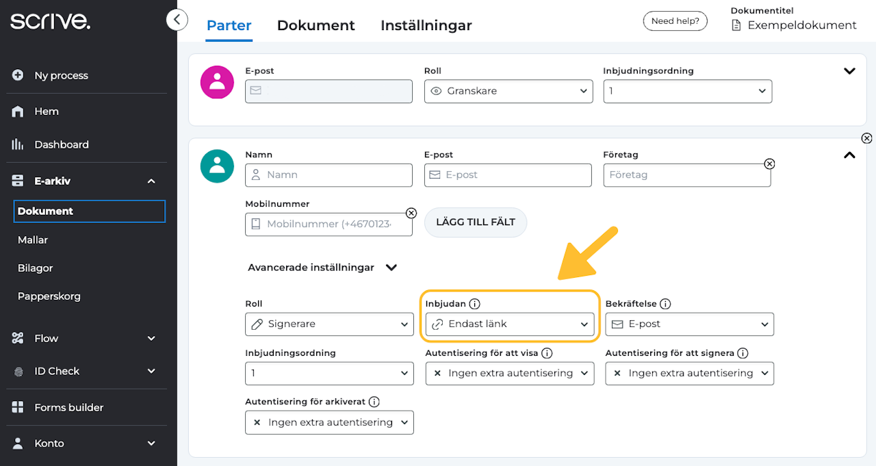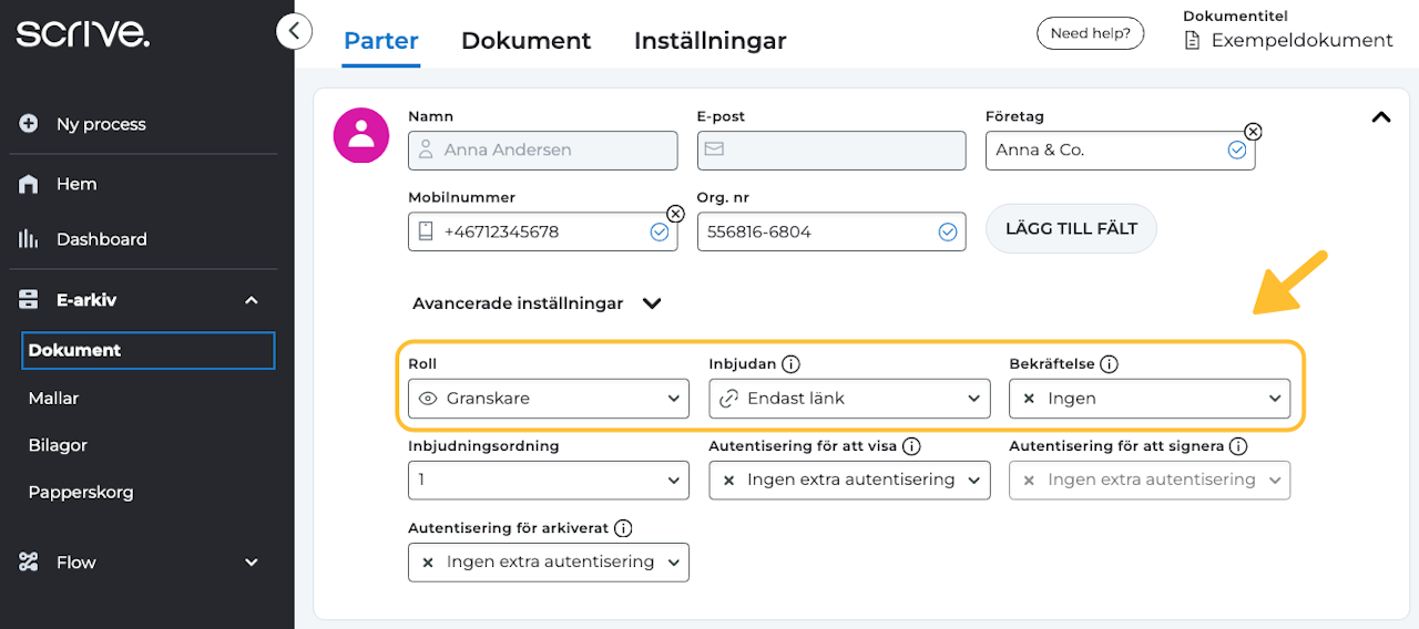 Navigera till fliken "Parter", välj den första parten (dig själv) och justera inställningarna efter önskemål. Ändra till exempel din Roll till "Granskare" om du inte avser att själv signera varje dokument som genereras från länken.