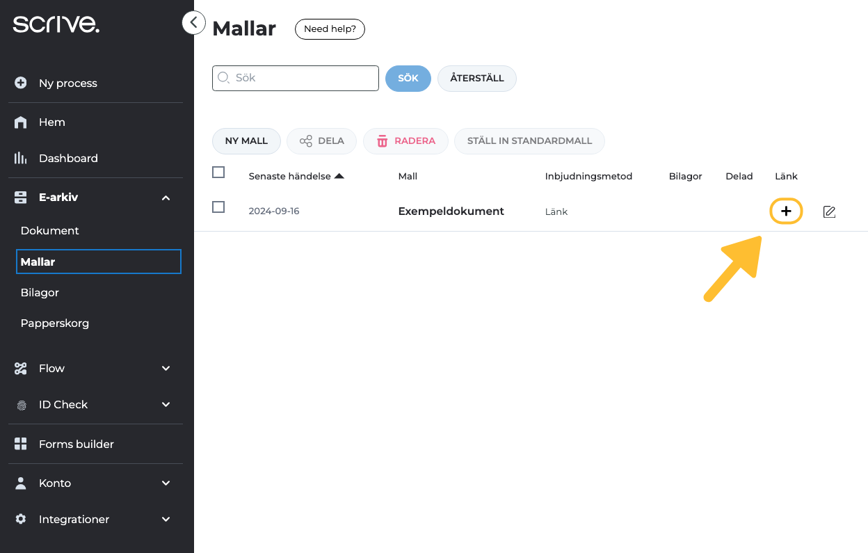 Öppna ditt E-arkiv och din lista med mallar. Leta upp den mall du tidigare skapade och klicka på plusikonen i kolumnen för Länk till höger.