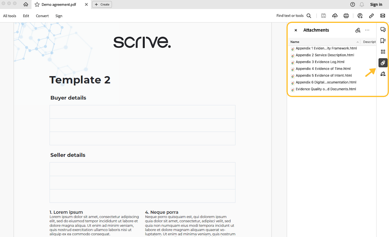 Ett enkelt sätt att visa det inbäddade HTML-bevisprotokollet är att öppna originaldokumentet i till exempel Adobe Acrobat Reader. Klicka på ikonen för bilagor för att visa listan över bilagor som tillsammans utgör bevisprotokollet. Alla bilagor är i HTML-format. Dubbelklicka på en fil för att öppna den i din webbläsare.