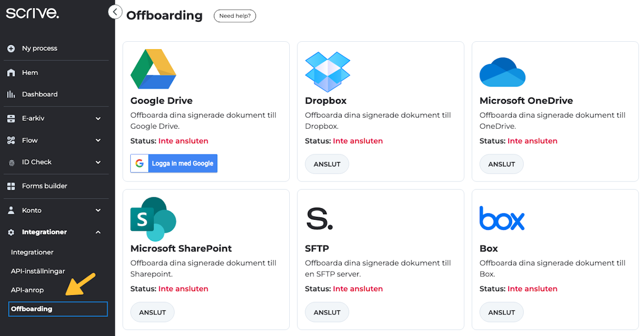 Om du vill automatiskt exportera signerade dokument från ditt E-arkiv till en extern tjänst som ditt företag använder, såsom Google Drive, Dropbox, Microsoft OneDrive eller SharePoint med flera, rekommenderar vi att du använder en av våra integrationer för export, så kallad offboarding.