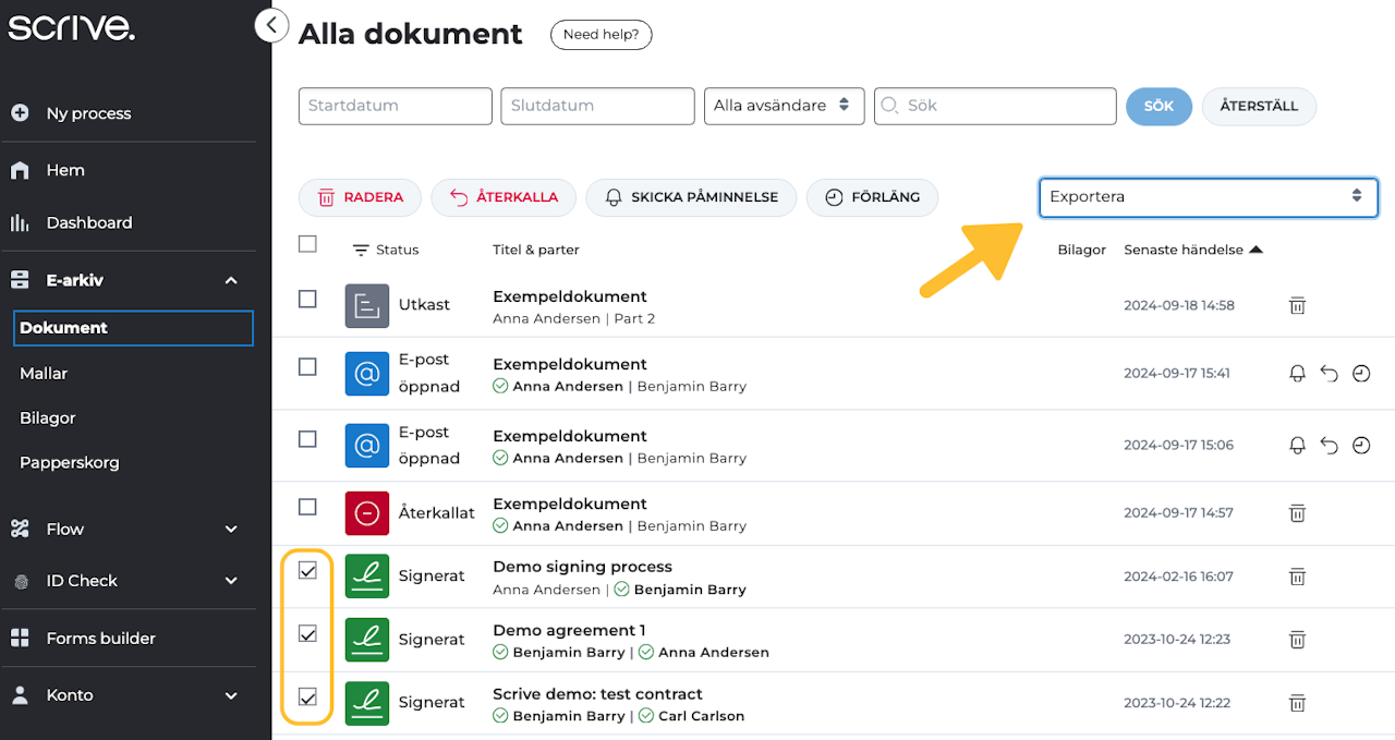 Välj ett eller flera dokument från ditt E-arkiv som du vill ladda ner/exportera till din enhet.