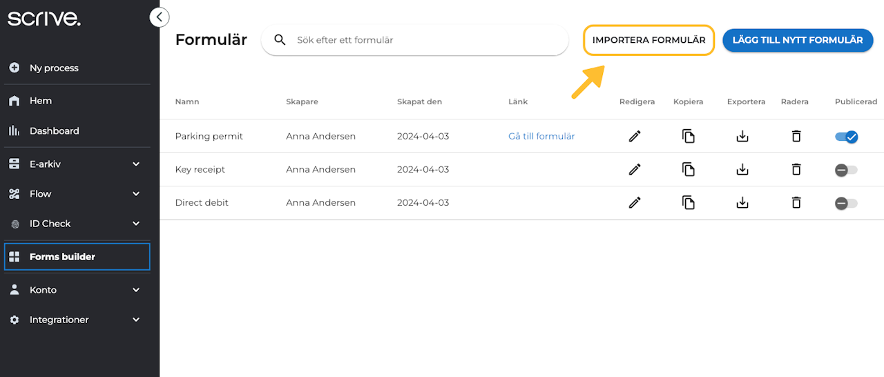 Klicka på knappen "Importera formulär" i det övre högra hörnet.