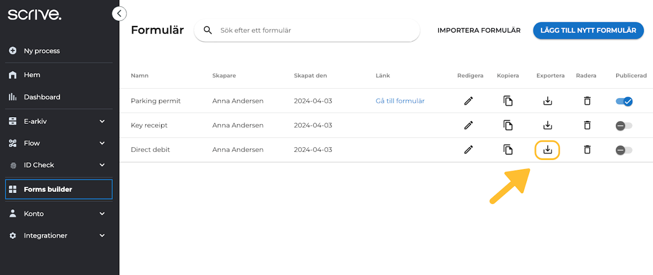 Leta upp det formulär du vill exportera och klicka på exportikonen bredvid dess titel. Denna åtgärd laddar automatiskt ner en JSON-textfil som innehåller alla inställningar och innehåll från ditt formulär.