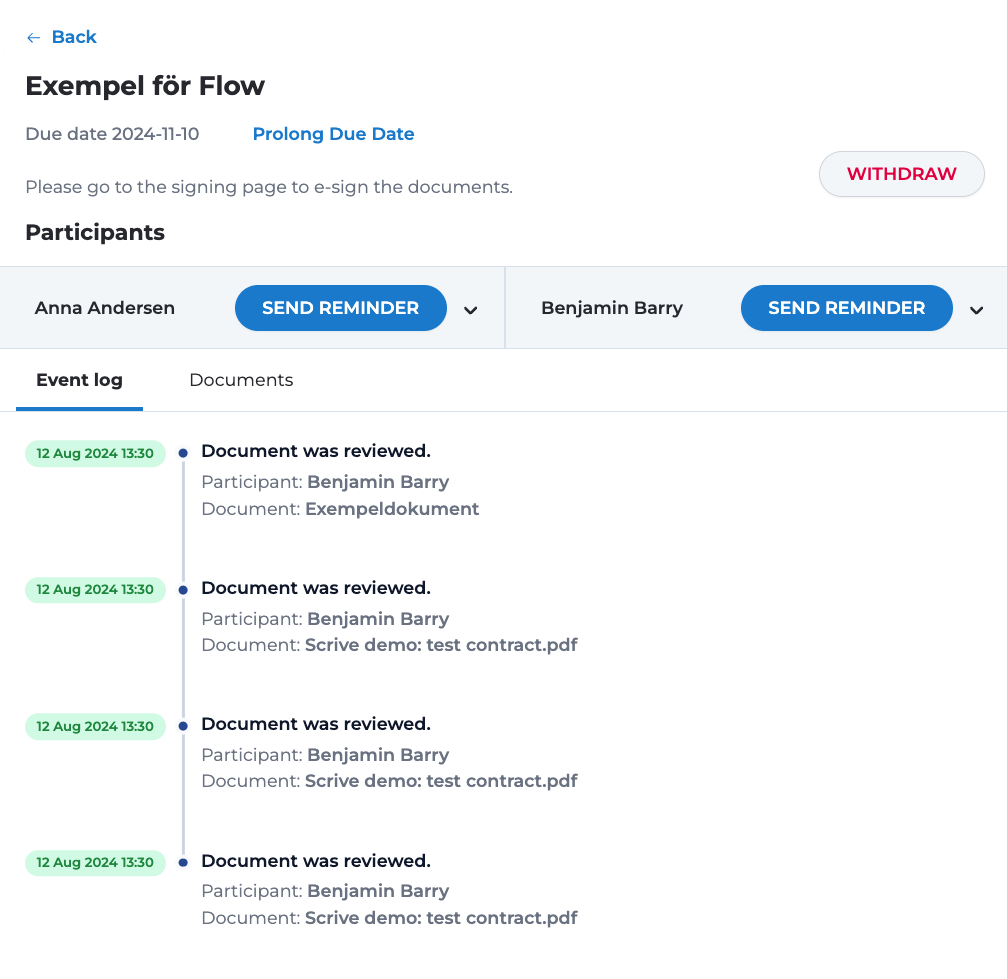 Ladda ner dokument. Efter att signeringsprocessen är slutförd och dokumenten har förseglats, kan du också ladda ner de förseglade versionerna, som inkluderar signaturerna och bevisprotokollet.