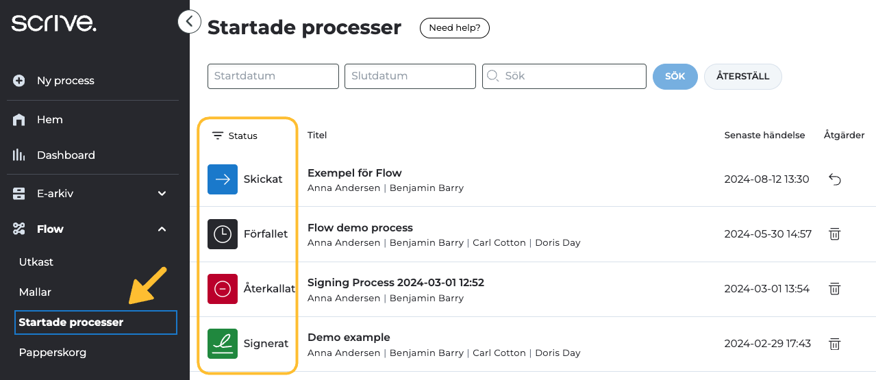 Genom att följa statusen för en signeringsprocess i Flow får du en översikt över de slutförda stegen och de återstående åtgärderna som behövs för att processen ska bli klar.