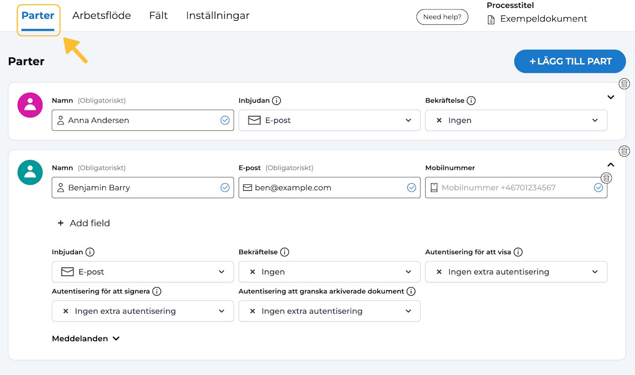 Under fliken "Parter" kan du lägga till och redigera information om de personer som deltar i din signeringsprocess.
