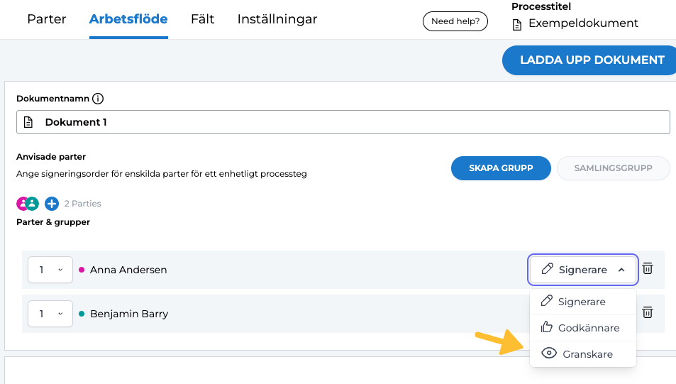 Rollen som granskare ger möjlighet att få tillgång till dokumentet utan att behöva signera eller godkänna det. Granskare kan granska allt innehåll i dokumentet men har inte möjlighet att godkänna, signera eller fylla i några tillagda fält i dokumentet.