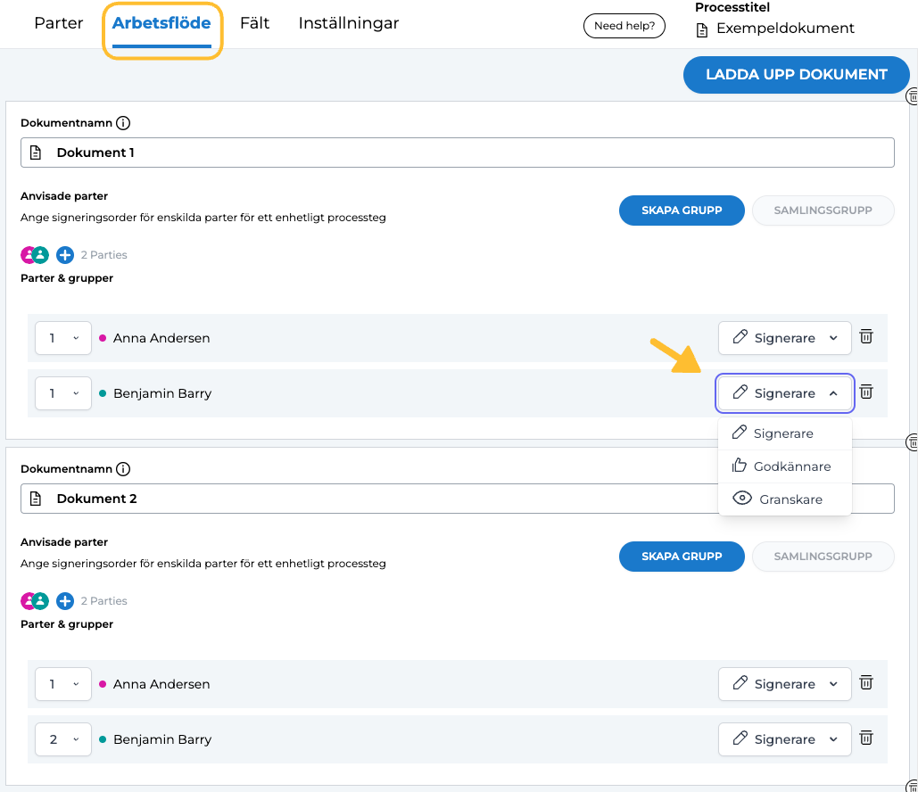 Rollen som signerare är avsedd för personer som ansvarar för att signera ett dokument med sin elektroniska signatur. Det är obligatoriskt att ha minst en part med denna roll i dokumentprocessen. Signerare har inte bara möjligheten att signera dokumentet, utan kan också fylla i eventuella fält som tilldelats dem i dokumentet.