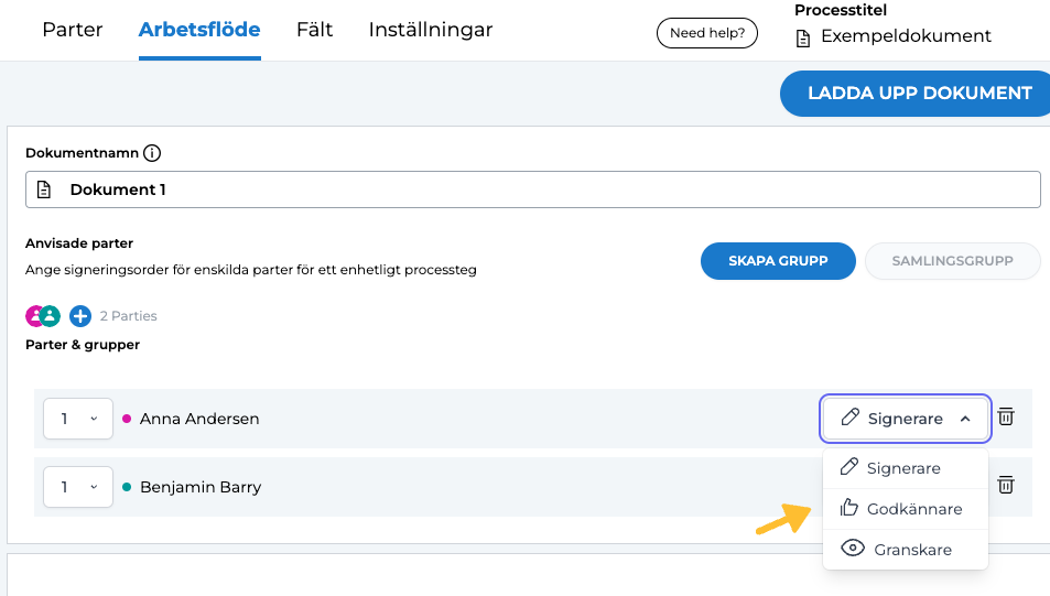 Rollen som godkännare är avsedd för personer som ansvarar för att godkänna innehållet i ett dokument utan att signera det. Godkännares inblandning är synlig för andra parter i dokumentprocessen.