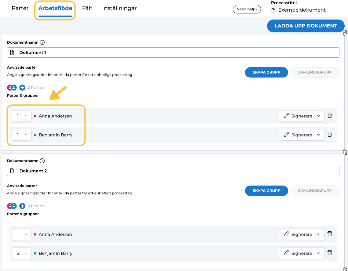Anna tilldelas inbjudningsordning 1 och Benjamin tilldelas inbjudningsordning 2, båda behöver signera dokumentet. I detta fall kommer Benjamin inte att få inbjudan att signera förrän Anna har slutfört sin signering.